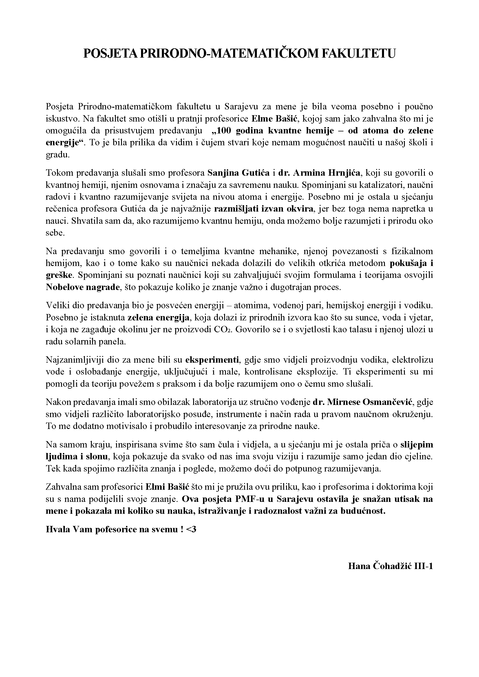 Na poziv Odsjeka za hemiju Prirodno-matematičkog fakulteta Univerziteta u Sarajevu u pratnji profesorice hemije Bašić Elme naši učenici su prisustvovali naučno-popularnom predavanju: